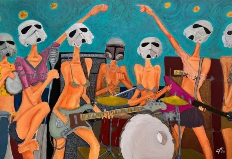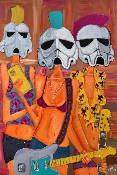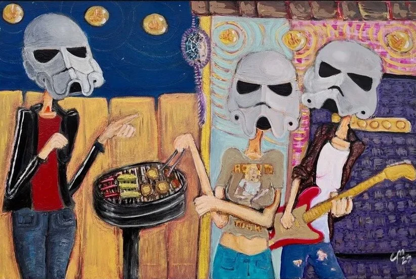 Troopertinas examines identity as a constructed system. Masked figures repeat across compositions, suggesting protection, performance, and emotional distance, while small shifts in posture and context reveal underlying human presence.