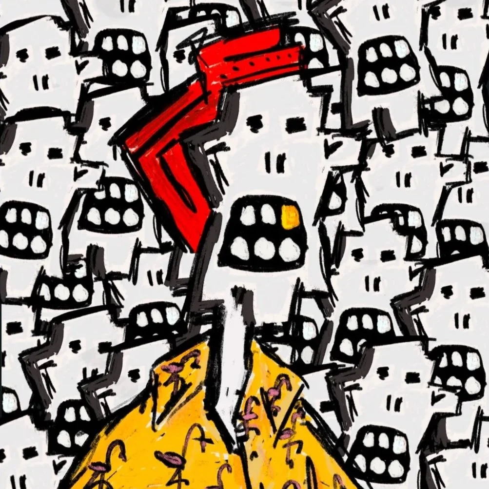 His work transforms burnout and personal struggle into bold, colorful narratives.